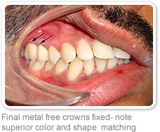 Porcelain Fused to Metal crowns/ Bridge (PFM): These are the most regular and economical crowns available at this clinic. They have a metal substructure over which porcelain is fused. They give reasonable aethethics, and hence we recommend them for back teeth like molars and premolars only. Occasionally a darker line will be visible at the edge of the crown, near to your gum when it recedes with age.