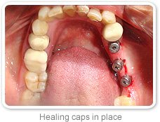 How are Dental Implants Attached in Your Mouth? The implant procedure is a surgical placement of the implant or implants in your jaw bone which requires a three to six month healing period before the implant restoration (crown) will be placed. During this healing time, the bone grows in and around the titanium implant creating a very strong support. The rejection or "failure" rate is minimal, only 1 to 2% of all implant procedures. After the implant has "taken" and you have sufficiently healed, a very natural crown is placed on the implant.